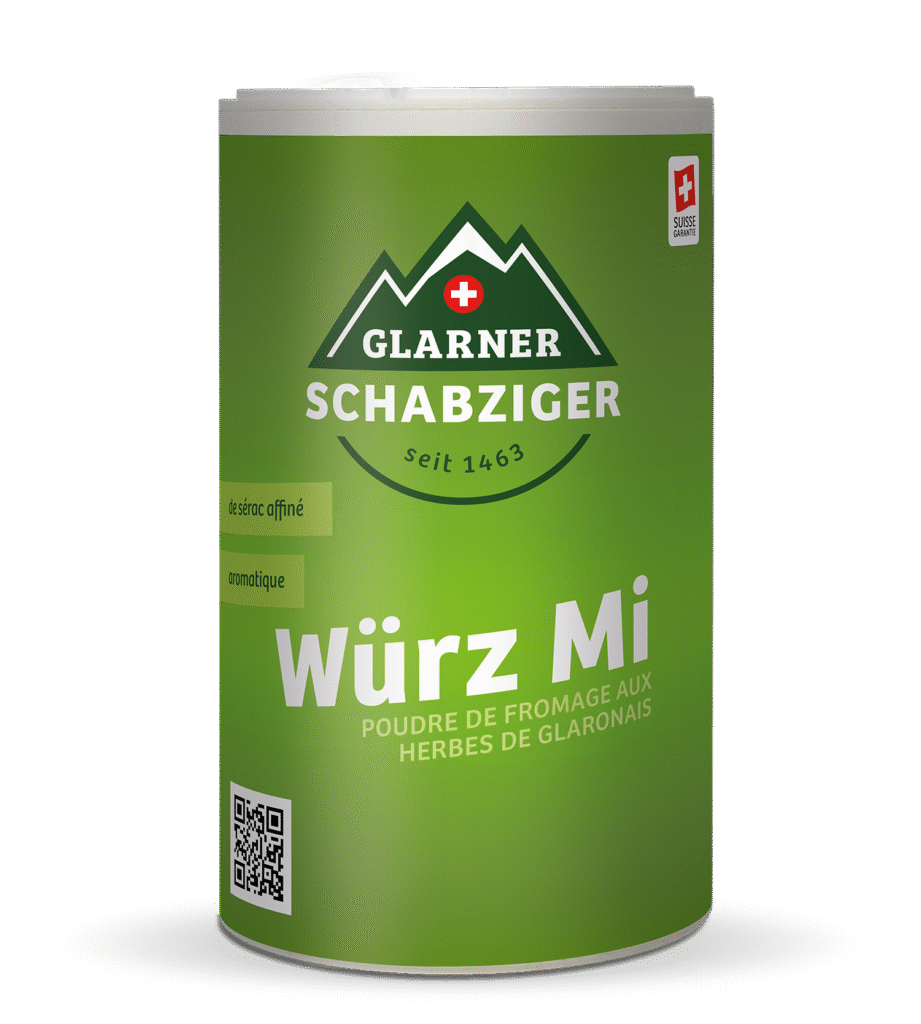Poudre de fromage aux herbes 100 % naturelle de Glarner Schabziger. Pour assaisonner les pâtes, le riz, les pommes de terre, la fondue, la raclette, les spätzli, les légumes, les sauces, etc.